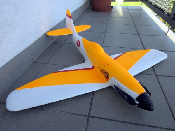 Pár technických údajů: rozpětí 882 mm délka trupu 812 mm plocha křídel 19 dm2 plošné zatížení 34 g/cm2 váha celého éra i s baterií 860g Jako povrchovka se používá leccos - od samolepek, které jsou ve stavebnici až po různé nástřiky. Já jsem se, vzhledem ke svému již vetchému zraku, snažil udělat éro co nejvíc viditelné a tak jsem zespodu dal modré pruhy a nahoře měl být oranžový nástřik. Když jsem zjistil, že mně sprej nevyjde, tak jsem nahoře udělal alespoň takový oranžový "výřez".