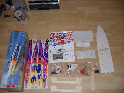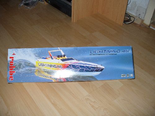 Ták i já jsem se nechal zlákat lodičkama a pro tento účel jsem zakoupil tuto stavebnici, Lightning 46, neb mě zlákala tím ,že to bude PÉRO (a podle dodaného vídea od našeho ADMIRÁLA fóglácké flotily Vítě ) opravdu JE ! Vypadá to,že Splaviska zažijí i jízdu po břehu .Zatím od včerejška pokračuji ve stavbě, je to stavebnice hodně předpracovaná vybavená všemi potřebnými komponenty (mimo lepidel,mazacích tuků a RC)ke zdárnému dokončení modelu.Návod je v německém jazyce (a já jsem si některé důležité pokyny nechal od kamarádů přeložit) je doprovázena dostatečně přehlednými fotografiemi.To je zatím vše, jdu pokračovat ve stavbě Ta černá folie je tam jen pro zakrytí trupu před možným potřísněním lepidlem .Děkuji za pozornost plavbě ZDAR hihi.