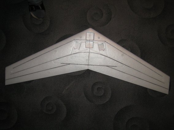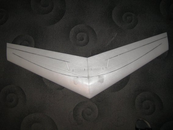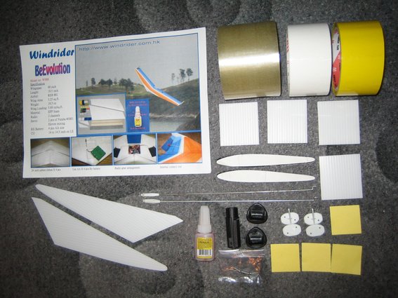V krabici dostaneme dvě poloviny křídel s vyznačenými zářezy pro uhlíky, otvory pro serva, baterku a přijímač. Dále dva 120 cm dlouhé uhlíky (3x1 mm), dva winglety z komůrkového plastu, dva balsové elevony s již seříznutým jedním rohem, sucháče na uchycení wingletů, kompletní táhla k servům s pákami na elevony (pro neznalé = sdružená výšková a směrová kormidla podél odtokovky křídla), krytky serv a otvorů na přijímač a baterky z komůrkového plastu, tři píšťalky !!, dvě barevné široké izolepy na potah, extrémně širokou skelnou pásku, lepidlo (bylo ji zkamenělé) a stručný kreslený návod na sestrojení. V podstatě se dá říct, že člověk dodá jen elektroniku a to je vše.