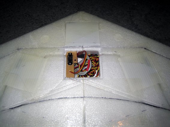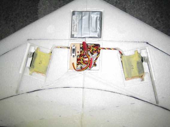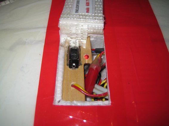 Následně jsem se vrhl na elektroniku. Do komůrky jsem vecpal (dobře zabalený proti ranám a otřesům) duplexácký přijímač, zafixoval ho tam a v okolním epp se snažil vyříznout díry pro fousy antén, aby byly od sebe v úhlu co nejbližším devadesáti stupňů. Nainstaloval jsem dvojitý přepínač, který buď zapne elektroniku křídla a nebo při přepnutí ji vypne a zároveň odepne baterku od přijímače (pro jistotu oba póly) a je možné ji přes vložený přijímačový konektor nabíjet. Přepínač s kontrolní blikající LEDkou (signalizuje zapnutí) jsem umístil na kousek tenké překližky, kterou jsem vlepil do části prostoru s přijímačem a celý prostor jsem zakryl komůrkovým plastem. Nad vypínačem jsem v něm udělal otevírací okénko na pantu ze skelné pásky.