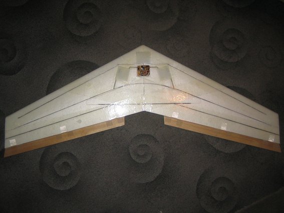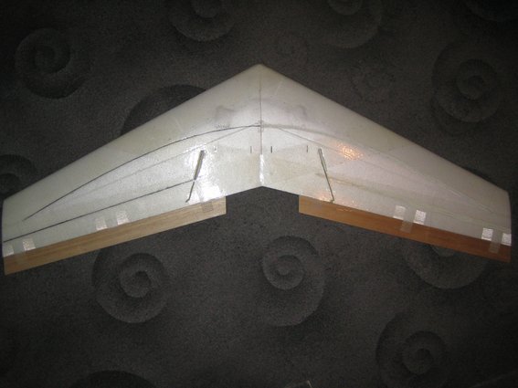 Hotové křídlo jsem zvážil a má 630g. To sice není zrovna nejméně, ale na webu jsem se dočetl, že takovou a i větší váhu má většina stavitelů, takže jsem v klidu. Těžiště mně vyšlo 205 mm od špičky, což je v normě uváděné na fórech (cca 190 až 216 mm).