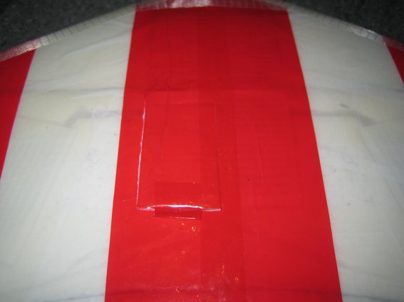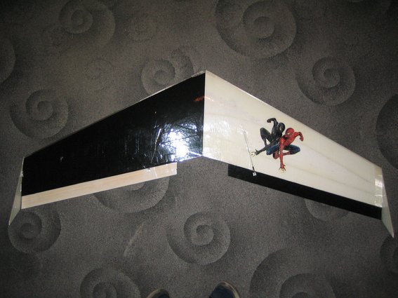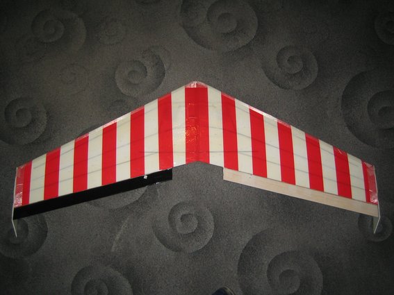 Na závěr jsem postříkal celé křídlo zase lepidlem (viz výše) a potáhl jej svým bojovým potahem, jako mělo minulé křídlo. Tento potah se mně osvědčil, protože je dobře rozlišitelný od ostatních a ve vzduchu je vůbec výrazný. Od výrobce jsem sice dostal dvě pásky na potah - bílou a žlutou, ale ty jsem nevyužil. Potahové pásky se mně (a nejen mně) osvědčily od firmy Alera - jsou za slušnou cenu a jsou tenké a lehké. Někdo ještě na závěr celý potah lehce (!) zažehluje, aby to lépe drželo. Mně to drží i tak dost, takže s žehličkou na epp radši neexperimentuji.