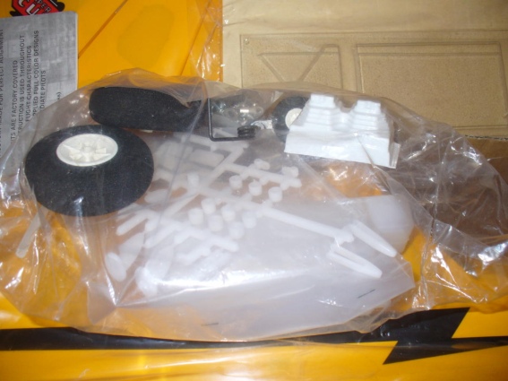 Další balíčky obsahují plastovou kapotáž motoru, prosklení kabiny, spojovací materiál, mechová podvozková kola (vyměnil jsem je za větší průměr - 75 mm, značka Kavan), 4 ks ocelového lanka (dvě lanka jsou na výztuhu výškového kormidla a dvě jsou součásti podvozku).