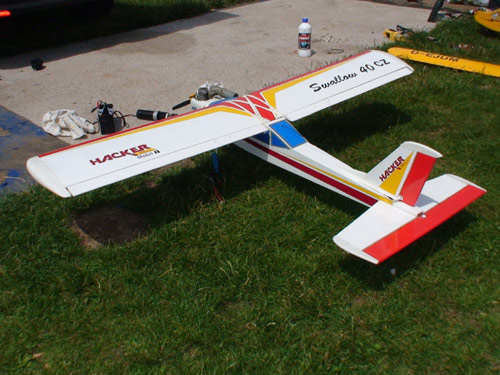 Musím do této rubriky přidat nedávný přírůstek do mého hangáru, jedná se o model fy Hacker, rozpětí 1630mm, délka 1260mm, hmotnost bez paliva 2,8kg, motor MVVS 6.5 ccm. Dnes byl cca po šesté ve vzduchu, zatím spokojenost, až na motor, který ještě není optimálně vyladěn, ještě si s ním musím vyhrát