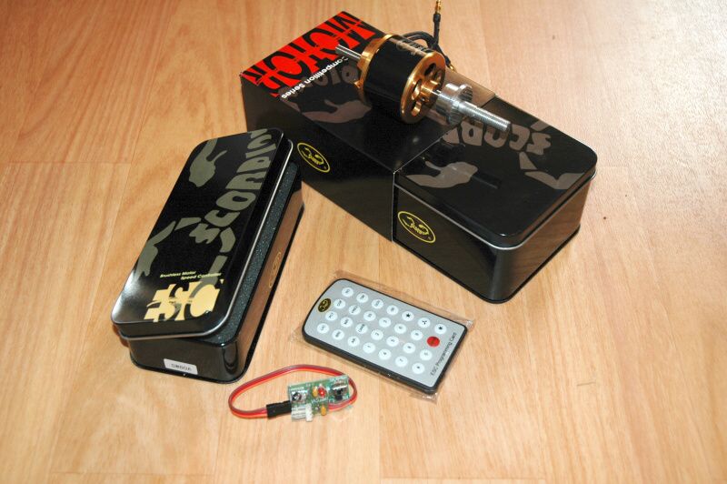 létání je potřeba něco obětovat Na obrázku je vidět pohonná sada , programovací karta regulátoru s jednotkou dálkového ovládání - funguje na IR přenosu.