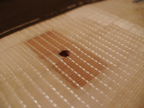 Odstranil jsem na obou stranách křídla nezbytný kus potahu, odměřil a poznačil místo provrtání křídla, konkrétně 17,5cm od špice, tzn. 3cm před těžištěm. Provrtal do křídla 6mm díru, vyřezal dvě destičky z 4mm překližky o rozměrech 4x2cm, provrtal v nich 6mm otvor, zahloubil do křídla (z každé strany křídla jednu) a přilepil purexem. Destičky pojistil skelnou a přelepil potahem. Odlil jsem dvě olova, 80 a 130g pro různé povětrnostní podmínky a ty budu na křídlo fixovat plastovým šroubem a matkou M6, pod matku kovovou podložku (plastovou jsem nenašel).
