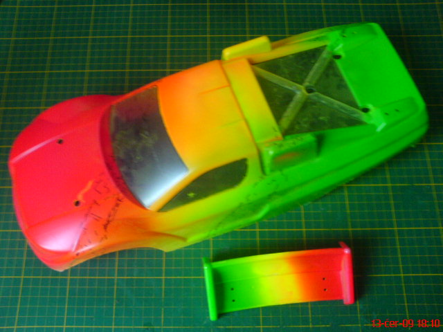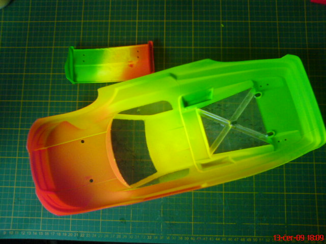 Kastli jsem nastrikal fluorescencnimi sprei,ktere jsem puvodne chtel pouzit u Destriera.(viz muj web) Zvolil jsem tri diagonalni pruhy s plynulymi prechody jedne barvy v druhou.