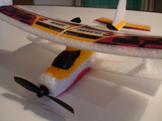 Tak se dá nazvat miniaturní model dvouplošníku z nerozbitného materiálu EPP, osazeného dvěma mini "Xmotory" s tlačnými vrtulkami. Mimochodem, mezi piloty z klubu mu neřekneme jinak, než "Komár", což je zřejmě nejvýstižnější přezdívka, vzhledem ke zvuku, který vydává :) Motorky pohání baterie 3,7V Lithium Polymer, která se dobíjí pomocí propojovacího drátu přímo z vysílače. Doba nabíjení se pohybuje okolo půl hodiny, následně Vás čeká zhruba 15 minut nefalšované zábavy, spojené například s nízkými průlety těsně nad zemí, okolo hlavy, mezi nohami, či přistávání do ruky. Dá se létat i ve větší místnosti nebo kanceláři. Letadlo je určeno do bezvětří, nebo slabého větru. V silnějším větru je pak obtížné dostat ho proti větru zpět k sobě.
