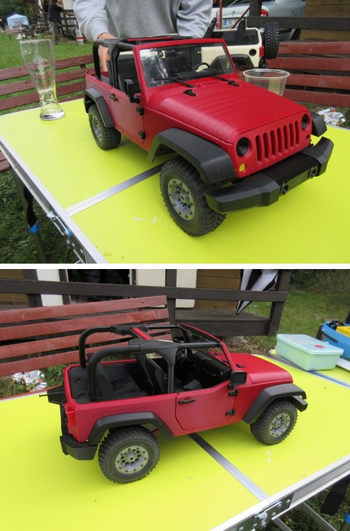 A vůbec nejzajímavější (alespoň pro mne) byly dva "jeepy", které vymysleli, nakreslili a vytiskli Ondra s Godrikem. Vše je vytištěno 3D tiskárnou, tedy až na elektroniku, nějaké ty pružiny a gumy. Jsou vymyšlené do nejmenších detailů a prakticky všechny díly jsou smontovány k sobě pouze šroubováním bez použití lepidla. Takže jakýkoliv poškozený díl se dá znovu vytisknout a vyměnit. Velice krásná práce - tleskám